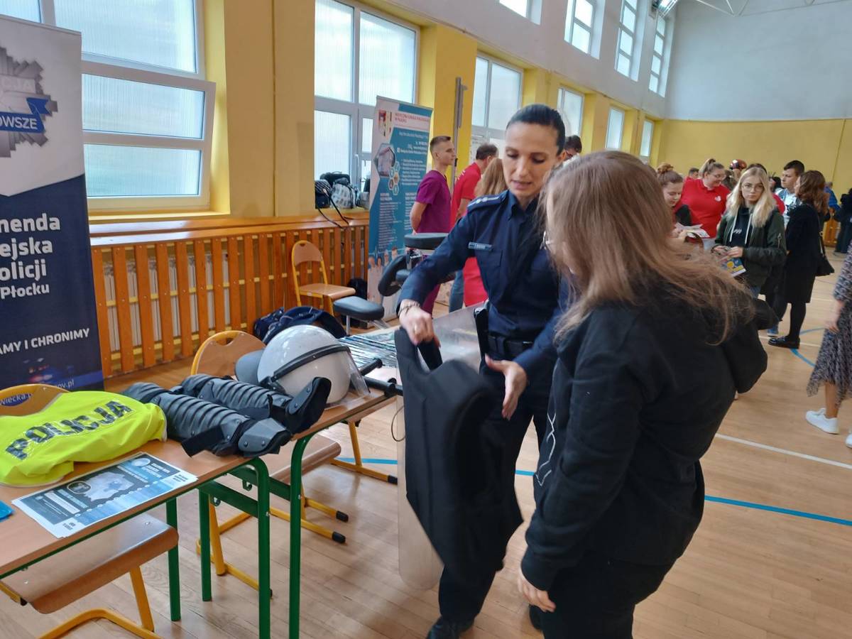 W dniu 13 października br. policjanci z Wydziału prewencji płockiej komendy wzięli udział w wydarzeniu „Wszyscy dbamy o bezpieczeństwo”, zorganizowanym przez Zespół Szkół Usług i Przedsiębiorczości w Płocku. Mundurowi przygotowali stoisko promujące zawód policjanta. Chętni mogli dowiedzieć się jak wygląda codzienna służba oraz przymierzyć elementy policyjnego umundurowani. Policjanci szczegółowo opowiedzieli również jakie wymagania należy spełnić aby zostać funkcjonariuszem policji oraz omówili poszczególne etapy postępowania kwalifikacyjnego w trakcie rekrutacji do służby. Zaineresowani uzyskali odpowiedzi na wszystkie nurtujące pytania.