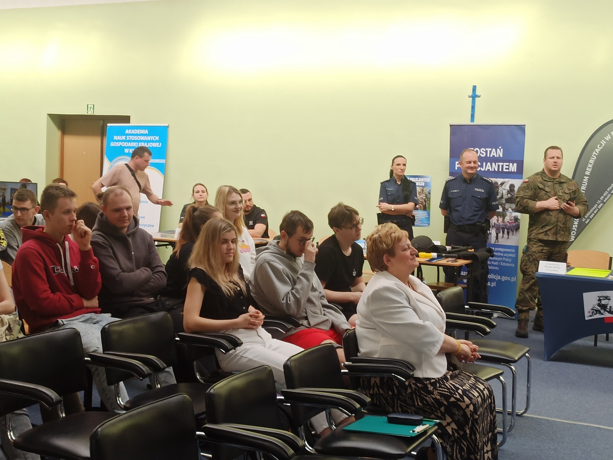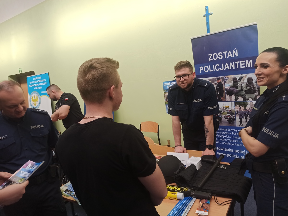 Wczoraj (9.04) przedstawiciele Komendy Miejskiej Policji w Płocku podczas szkolnych targów edukacji i pracy w Zespole Szkół im. Leokadii Bergerowej w Płocku, promowali zawód policjanta. Każdy zainteresowany mundurem uzyskał niezbędna wiedzę z zakresu procedur i rekrutacji do służby w Policji.