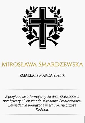 Z głębokim żalem zawiadamiamy, że 17 marca br. odszedła nasza Koleżanka Mirosława Smardzewska, wieloletnia pracownica cywilna policji. Kierownictwo Komendy Miejskiej Policji w Płocku, w imieniu policjantów oraz pracowników Policji, rodzinie i przyjaciołom składa najszczersze kondolencje oraz wyrazy głębokiego współczucia.