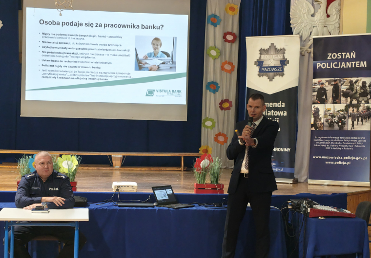 Ważny głos w dyskusji zabrał również przedstawiciel jednego z banków działających na terenie Czerwińska, który opowiedział o zagrożeniach, z jakimi na co dzień spotykają się klienci banków. Przestrzegał przed fałszywymi wiadomościami SMS i e-mailami, podszywającymi się pod instytucje finansowe, a także przed udostępnianiem danych logowania osobom trzecim.
