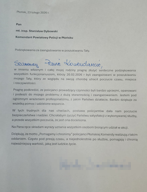 W piątek, 20 lutego, po godzinie 21 do Komendy Powiatowej Policji w Płońsk zgłosiła się zdenerwowana mieszkanka miasta. Kobieta poinformowała, że od kilku godzin nie ma kontaktu ze swoim 78-letnim mężem. Mężczyzna wyszedł z mieszkania w jednym z bloków na osiedlu przed południem. Miał udać się do poradni na wcześniej zaplanowaną wizytę. Nie zabrał ze sobą telefonu ani kluczy, obawiając się, że je zgubi. Senior cierpi na zaniki pamięci, a gdy nie wrócił do domu, rodzina rozpoczęła poszukiwania na własną rękę.