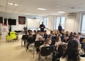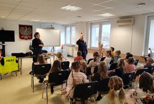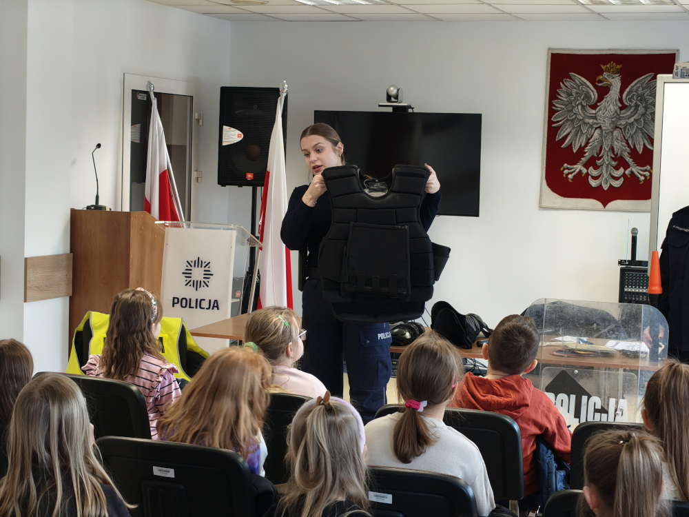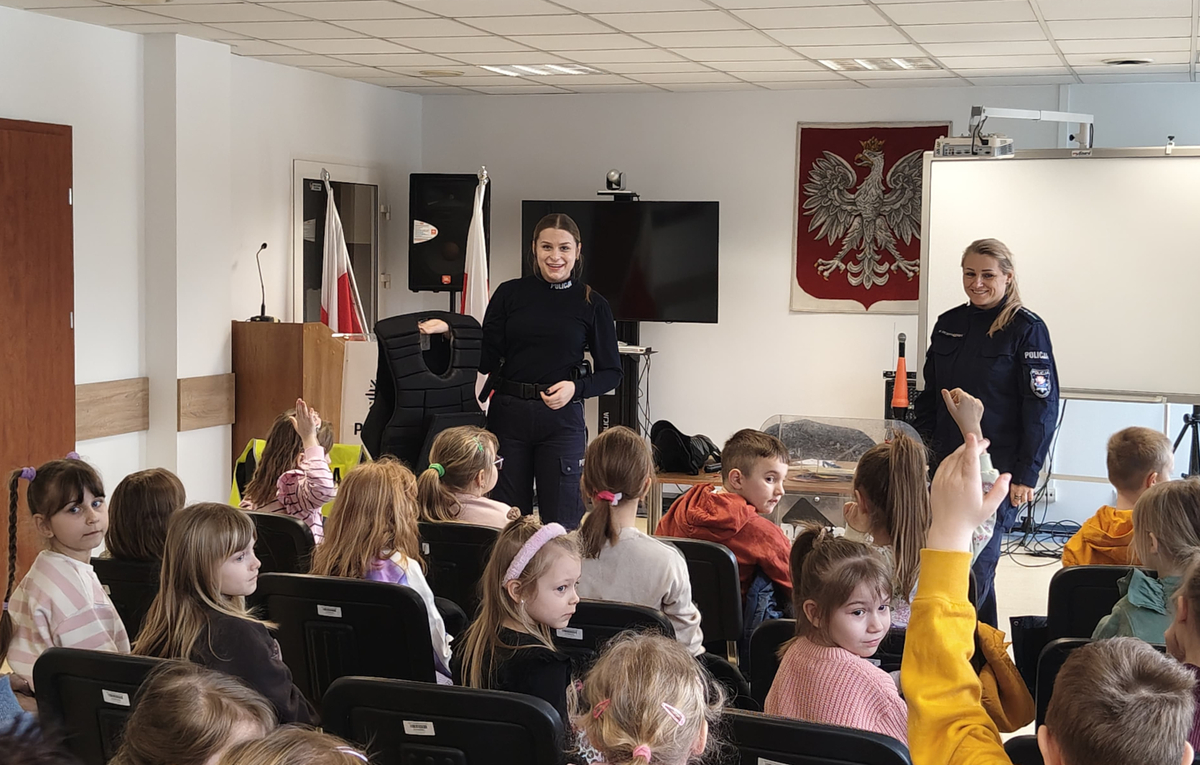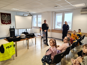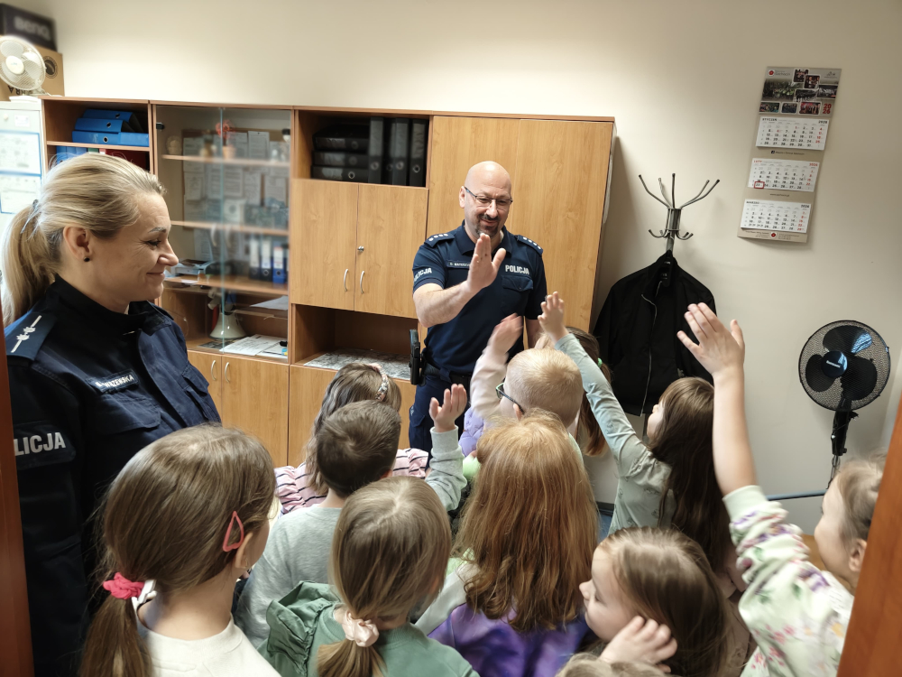 Nie zabrakło również rozmowy o bezpieczeństwie. Policjanci przypomnieli najmłodszym, jak prawidłowo przechodzić przez jezdnię, jak zachować się w kontakcie z osobą obcą oraz w jaki sposób wezwać pomoc w sytuacji zagrożenia. Spotkanie przebiegło w miłej atmosferze, a zdobyta wiedza z pewnością pomoże dzieciom lepiej rozumieć zasady bezpieczeństwa i rolę policji w życiu lokalnej społeczności.