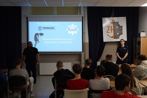 W czwartek (30 października) policjanci KPP w Pułtusku – mł. asp. Rafał Grabowski i sierż. Aneta Przybysz przeprowadzili spotkanie profilaktyczne z uczniami Zespołu Szkół Zawodowych im. Jana Ruszkowskiego w Pułtusku. Celem zajęć było podniesienie świadomości młodzieży na temat bezpieczeństwa, odpowiedzialności i życia wolnego od przemocy, a także przybliżenie specyfiki zawodu policjanta.