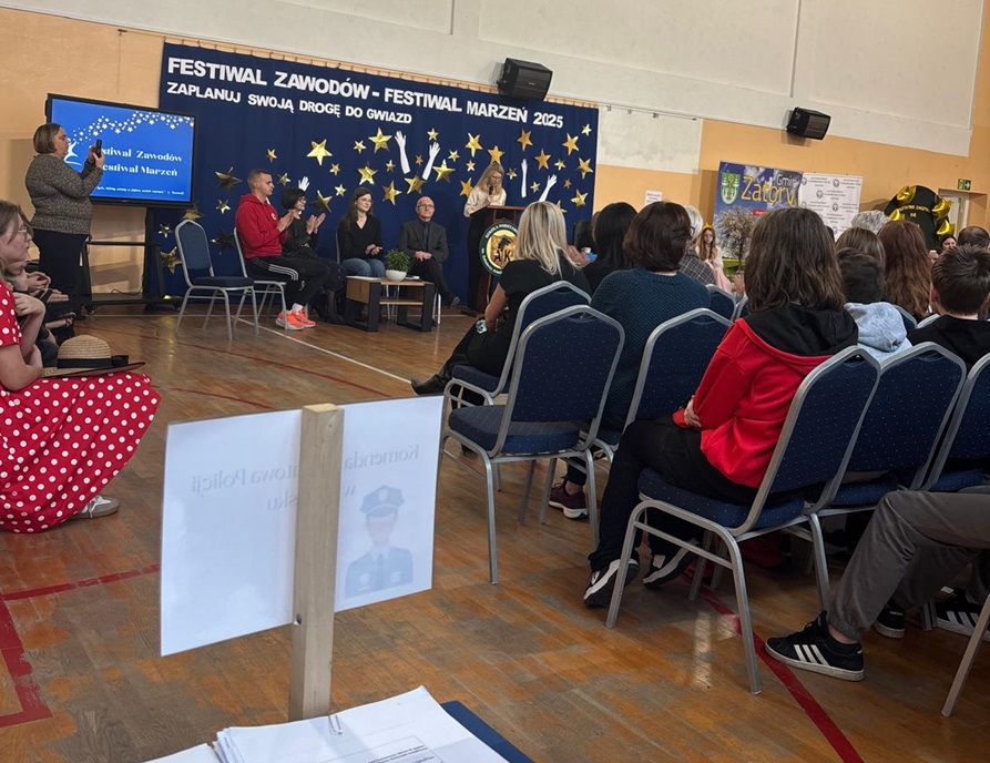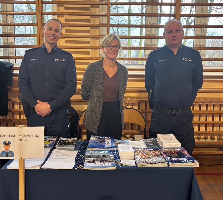 Wśród zaproszonych gości znaleźli się również przedstawiciele Komendy Powiatowej Policji w Pułtusku. Swoje stanowisko informacyjne przygotowali dzielnicowi: sierż. Paweł Malik i asp. szt. Radosław Pomaski, którym towarzyszyła Justyna Biegała z Zespołu Kadr. Funkcjonariusze opowiedzieli młodzieży o codziennych zadaniach policjantów oraz o możliwościach rozwoju zawodowego w tej formacji.
