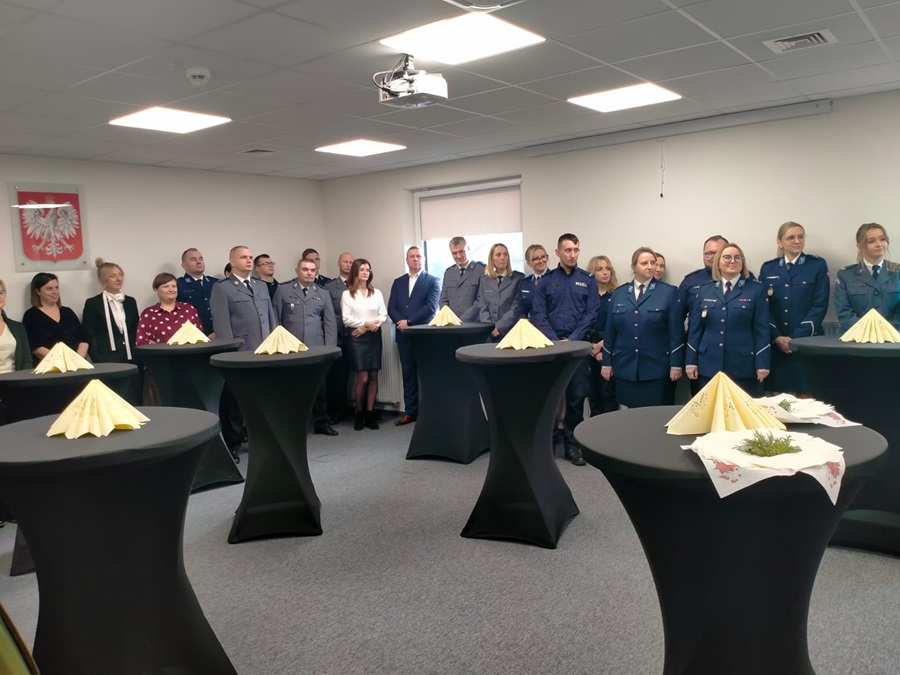 Po zakończeniu oficjalnej części apelu wszyscy goście udali się do sali konferencyjnej, gdzie odbyło się świąteczne spotkanie opłatkowe. Policjanci i pracownicy komendy wspólnie z zaproszonymi gośćmi składali sobie życzenia świąteczne i noworoczne, dziękowali za dotychczasową współpracę oraz dzielili się opłatkiem. Spotkanie upłynęło w ciepłej, rodzinnej atmosferze, którą dopełnił wspólny śpiew kolęd.