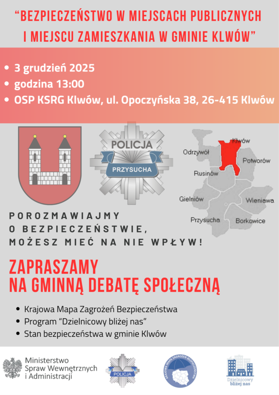 Zapraszamy na gminną Debatę Społeczną pn. "Bezpieczeństwo w miejscach publicznych i miejscu zamieszkania w gminie Klwów". Debata odbędzie się 3 grudnia br. o godzinie 13:00 w Ochotniczej Straży Pożarnej w Klwowie.