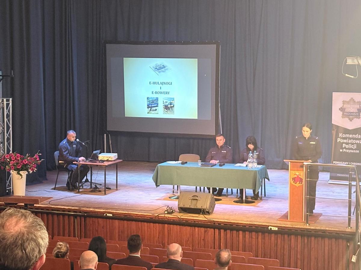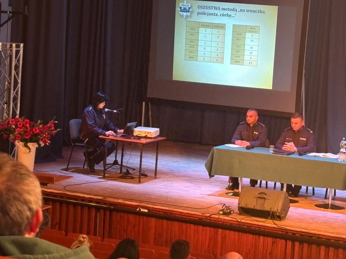 Kolejnym punktem, zreferowanym przez Zastępcę Naczelnika Wydziału Prewencji asp. Izabelę Górazdowską, była przestępczość, z jaką możemy się spotkać w wirtualnym świecie. Były to dane ilości przestępstw gospodarczych oraz najczęściej używane metody oszustw na terenie powiatu przysuskiego. Zaprezentowała, na czym polegają metody, które wykorzystują oszuści na podstawie danych Urzędu Komisji Nadzoru Finansowego w Warszawie. Ostatnim celem Pani Naczelnik była prezentacja rejonów dzielnicowych oraz policjantów odpowiedzialnych za nie. Wytłumaczyła również zasady działania aplikacji Moja Komenda oraz na czym polega program „Dzielnicowy bliżej nas”