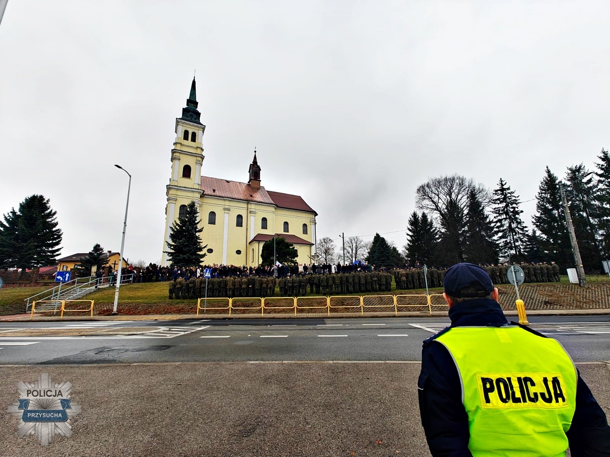 W tym samym czasie policjanci z Komendy Powiatowej Policji w Przysusze zabezpieczali teren przyległy do odbywających się uroczystości, czuwając nad bezpieczeństwem uczestników, pielgrzymów oraz mieszkańców biorących udział w wydarzeniach. Funkcjonariusze kierowali ruchem, dbali o płynność komunikacyjną oraz reagowali na wszelkie sytuacje mogące zagrażać porządkowi publicznemu.