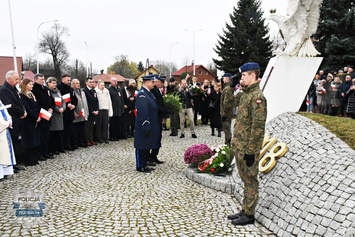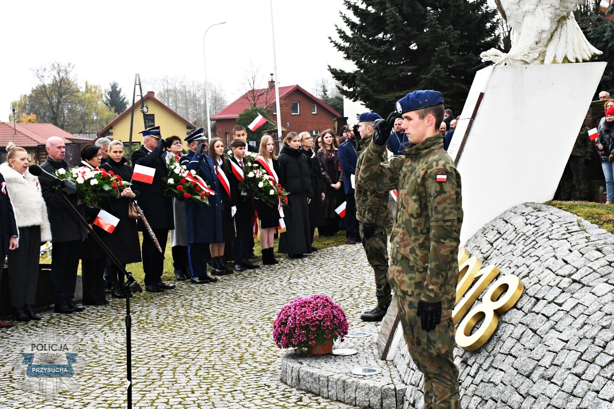 Policjanci z Komendy Powiatowej Policji w Przysusze dbali, aby uczestnicy obchodów Święta Niepodległości w powiecie przysuskim spędzili uroczystości, przemarsze, biegi bezpiecznie i bez wydarzeń. Komendant Powiatowy Policji w Przysusze złożył kwiaty pod pomnikiem Orła Białego w Skrzyńsku, oddając hołd bohaterom, którzy walczyli o wolność Ojczyzny.