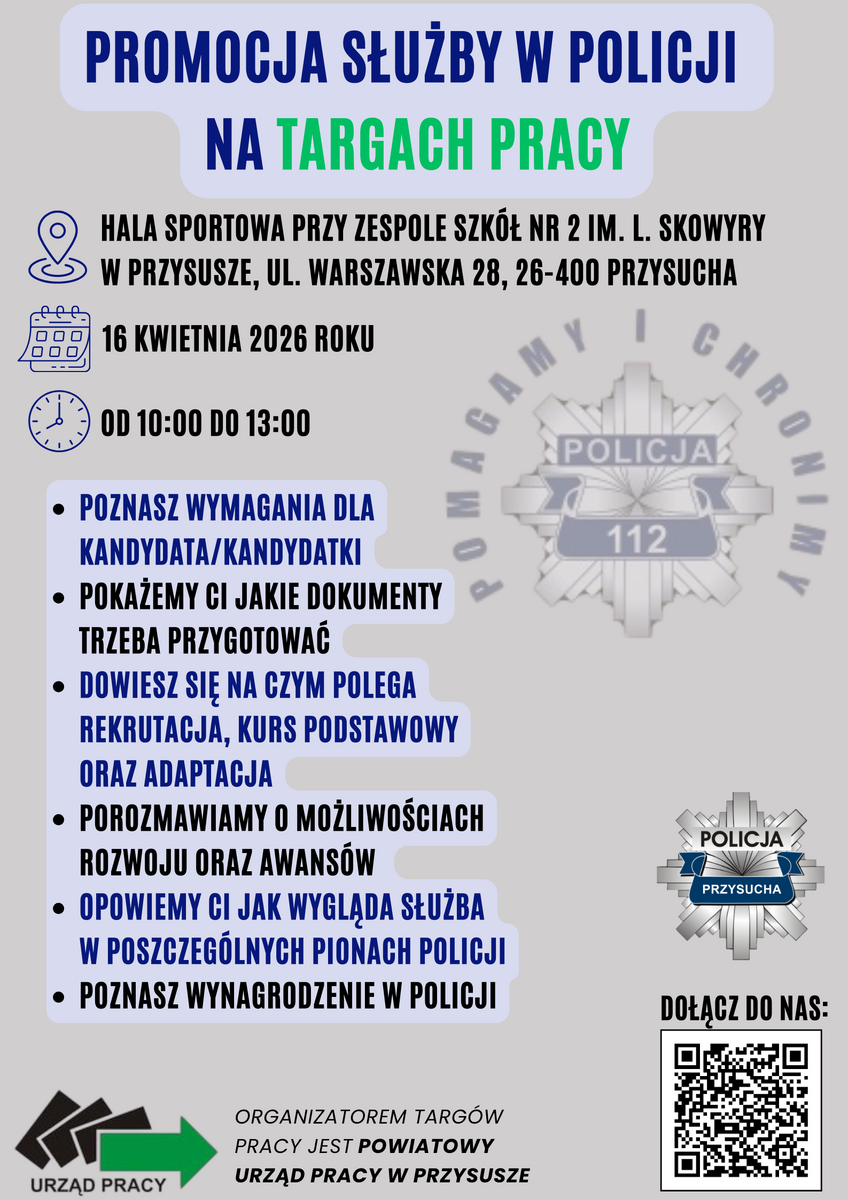 16 kwietnia w godzinach od 10:00 do 14:00 policjanci z Komendy Powiatowej Policji w Przysusze będą obecni na Targach Pracy organizowanych przez Urząd Pracy w Przysusze w Hali Sportowej przy Zespole Szkół nr 2 im. Ludwika Skowyry w Przysusze. Zachęcamy do odwiedzenia stoiska policyjnego oraz poznania szczegółów rekrutacji i Służby w Policji.