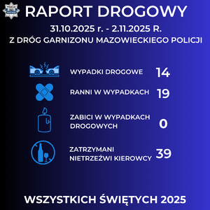 Ze wstępnych danych wynika, że przez trzy dni akcji „Wszystkich Świętych”, która nadal trwa i zakończy się dopiero późnym wieczorem 3 listopada, na drogach garnizonu mazowieckiego doszło do 14 wypadków, w których rannych zostało 19 osób. Policjanci zatrzymali również 39 nietrzeźwych kierowców. Funkcjonariusze wciąż prowadzą działania, nadzorując ruch wokół nekropolii oraz na głównych ciągach komunikacyjnych, aby zapewnić bezpieczny powrót osób odwiedzających groby bliskich.