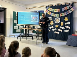W miniony piątek ( 21.11), dzielnicowy st. asp. Grzegorz Szymański odwiedził uczniów Szkoły Podstawowej w Romanach Seborach, by przypomnieć im, jak ważna dla bezpieczeństwa jest widoczność pieszego po zmroku oraz właściwe zachowania na drodze.