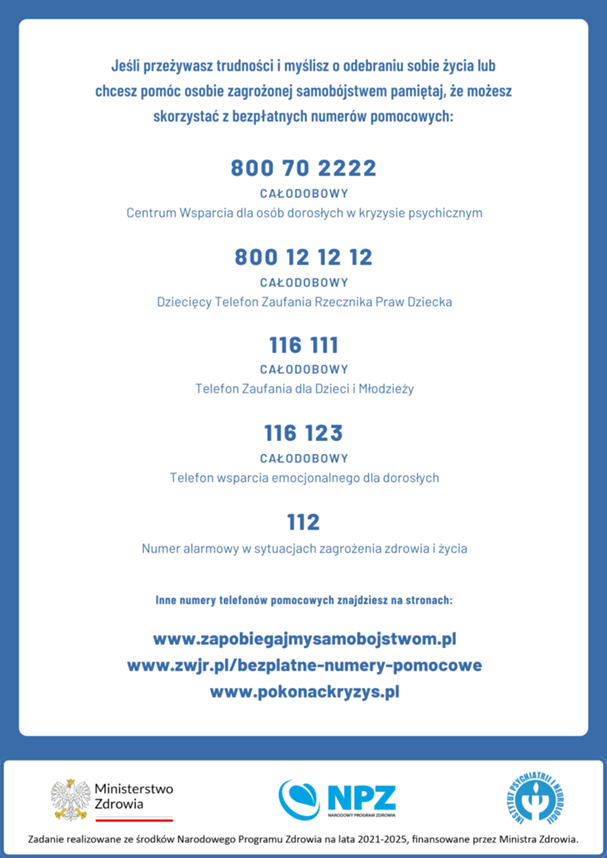 Przypominamy, że każdy, kto znajduje się w trudnej sytuacji życiowej lub emocjonalnej, może skorzystać z dostępnym form pomocy.