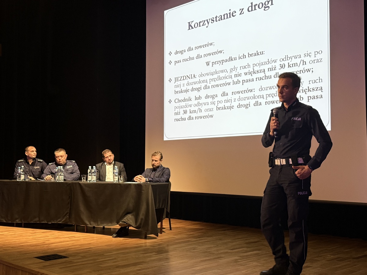 Po wystąpieniach prelegentów głos zabrali Starosta Przasnyski oraz Zastępca Burmistrza Przasnysza. Starosta podziękował policjantom za inicjatywę i podjęcie ważnego społecznego tematu, podkreślając, że edukacja i profilaktyka są najskuteczniejszym sposobem ograniczenia liczby wypadków i niebezpiecznych zachowań na drogach. Po oficjalnych wystąpieniach odbyła się otwarta dyskusja. Uczestnicy chętnie zabierali głos, dzieląc się swoimi spostrzeżeniami i propozycjami działań profilaktycznych. Nauczyciele obecni na sali złożyli wniosek, aby tego typu prelekcje poświęcone problematyce korzystania z hulajnóg elektrycznych odbywały się w szkołach na terenie całego powiatu przasnyskiego.