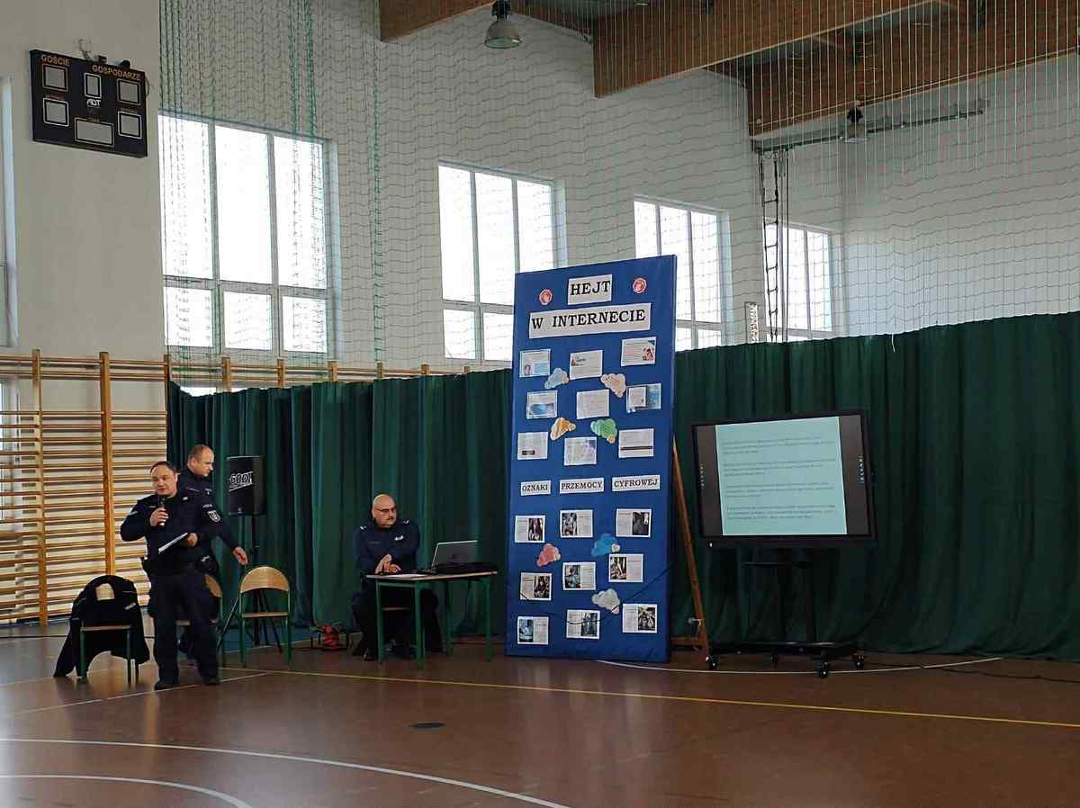 W dalszej części spotkania funkcjonariusze przedstawili narzędzia, które umożliwiają mieszkańcom współtworzenie bezpieczeństwa w swoich miejscowościach – „Krajową Mapę Zagrożeń Bezpieczeństwa” oraz program „Dzielnicowy bliżej nas”. Następnie st. asp. Grzegorz Szymański zaprezentował problematykę hejtu w Internecie, omawiając jego formy, konsekwencje oraz sposoby reagowania na cyberprzemoc. Wskazał również, jak i gdzie zgłaszać przypadki hejtu zarówno w środowisku szkolnym, jak i w sieci.