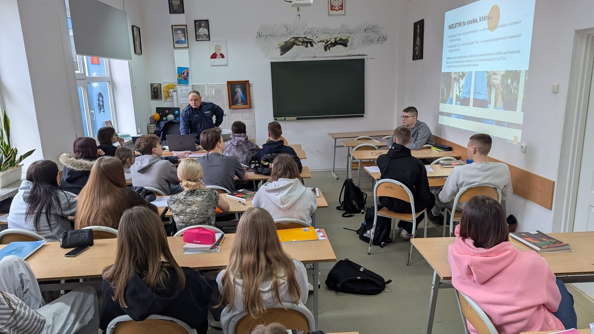 Podczas spotkania policjant przedstawił zagadnienia związane z odpowiedzialnością nieletnich za popełniane czyny karalne i za zachowania niezgodne z przyjętymi normami społecznymi. Poinformował również o zjawisku cyberprzemocy, zagrożeniach płynących z sieci oraz sposobach bezpiecznego korzystania z Internetu. Wszystko to miało na celu zwiększenie świadomości młodego pokolenia w kwestii zagrożeń i konsekwencji prawnych. Wizyta w szkole była także okazją do poruszenia problematyki narkotyków, dopalaczy i środków odurzających, a wszystko po to, by uświadomić młodzież, jakie zagrożenia pojawiają się wokół nich. Policjant omówił także konsekwencje prawne wynikające z kontaktu z substancjami psychoaktywnymi, w tym także kary za ich posiadanie, udostępnianie czy też handel. Uczniowie wykazali spore zainteresowanie poruszanymi zagadnieniami, dyskutowali, zadawali prowadzącemu pytania. Mamy nadzieję, że uczestnictwo w tego typu zajęciach przyczyni się do wzrostu świadomości i odpowiedzialności uczniów za swoje zachowanie.