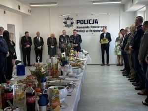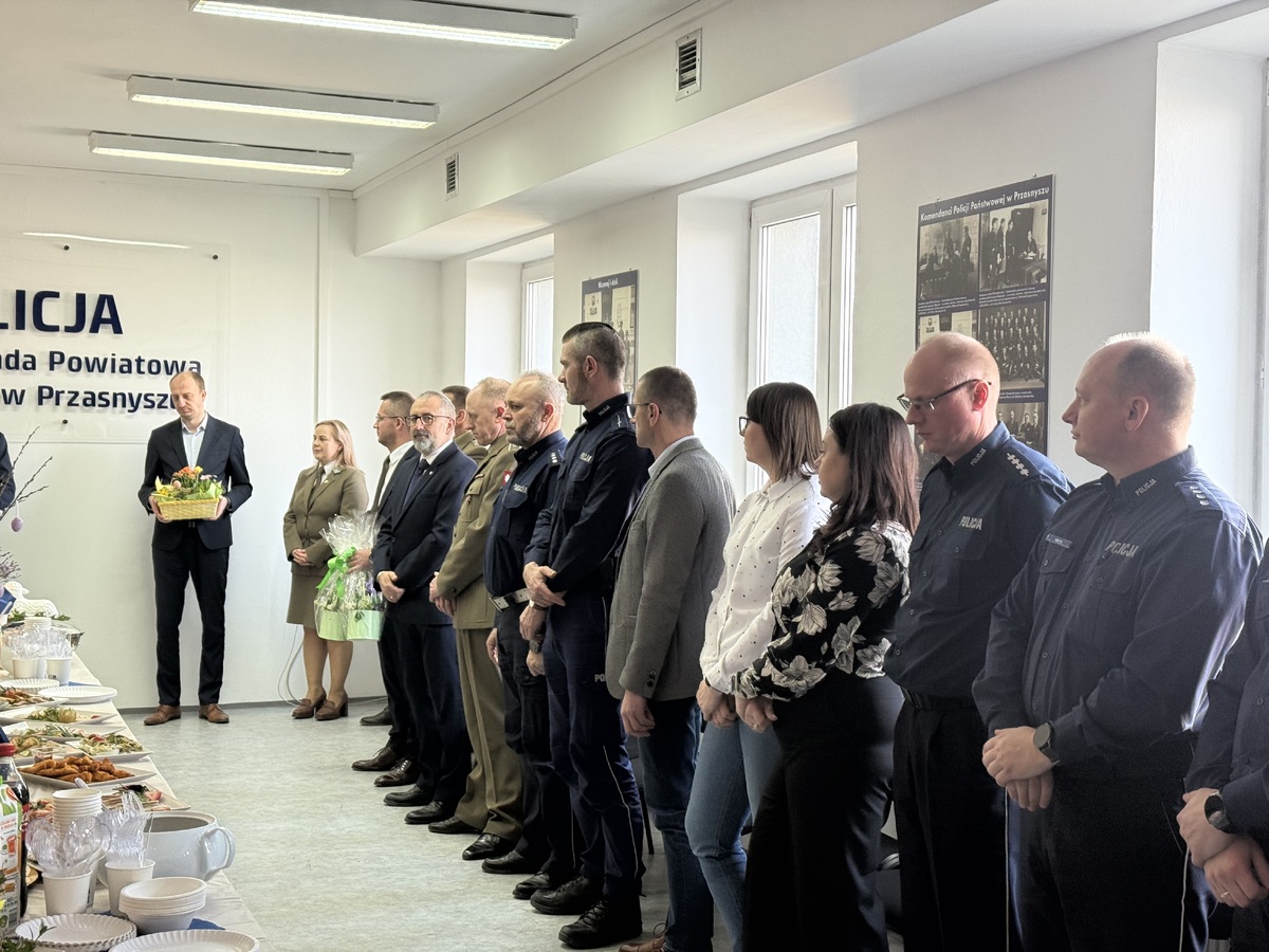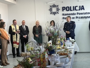 Policjanci oraz zaproszeni goście spotkali się z okazji Świąt Wielkanocnych. Życzenia spokojnych, rodzinnych świąt przekazał wszystkim Komendant Powiatowy Policji w Przasnyszu podinsp. Andrzej Dziadak, a świąteczne potrawy poświęcił Kapelan Policji Ks. Michał Gaszczyński. W spotkaniu uczestniczyli przedstawiciele miasta i samorządu terytorialnego oraz przedstawiciele jednostek współpracujących z przasnyską policją.