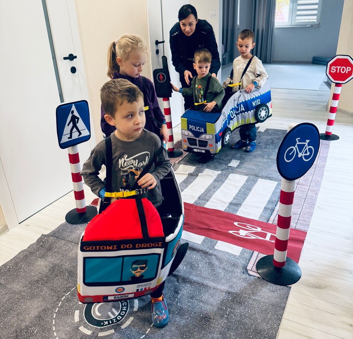 Mundurowe uczyły dzieci m.in. zasady bezpiecznego przechodzenia przez jezdnię, jak zachować się na przejściu dla pieszych i przy sygnalizacji świetlnej. Ogromną radość sprawiła dzieciom zabawa na mini miasteczku drogowym. Dzięki niemu przedszkolaki w formie zabawy mogły w praktyce przećwiczyć bezpieczne przechodzenie przez pasy, zatrzymywanie się przed sygnalizatorem świetlnym i poznały znaki drogowe.
