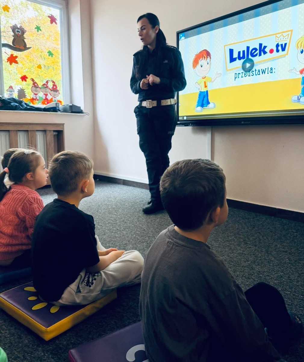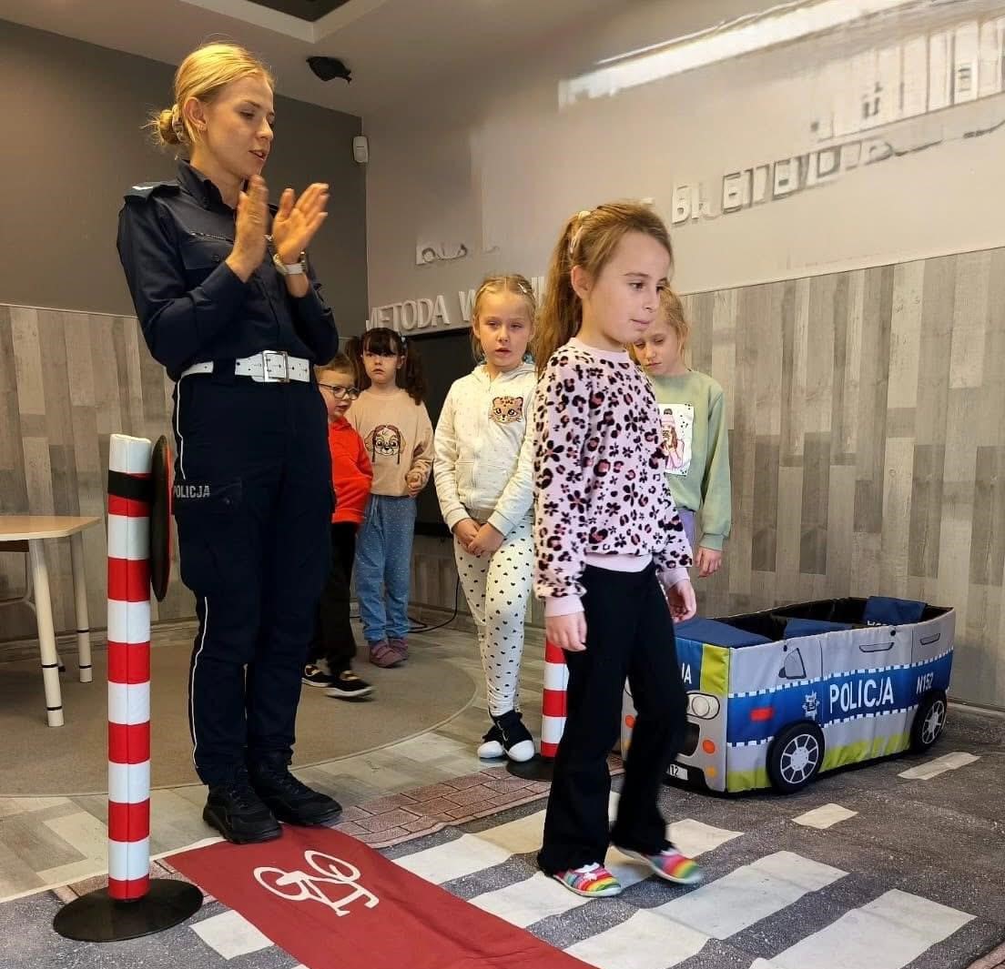W ramach działań profilaktycznych mundurowe z drogówki spotkały się z przedszkolakami, aby poprzez zabawę, rozmowę i praktyczne ćwiczenia nauczyć najmłodszych zasad bezpiecznego poruszania się po drogach.