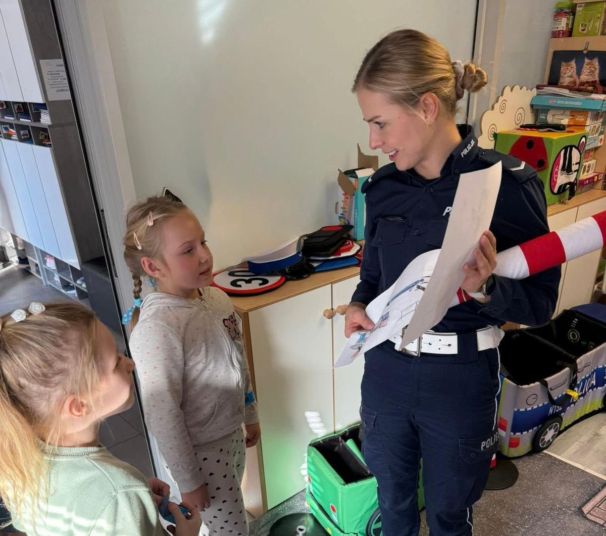 Policjantki zwróciły uwagę na to, że bardzo ważnym elementem zwiększającym bezpieczeństwo na drodze jest noszenie elementów odblaskowych oraz bycie widocznym na drodze, szczególnie w okresie jesienno-zimowym. Każde dziecko otrzymało też opaskę odblaskową.