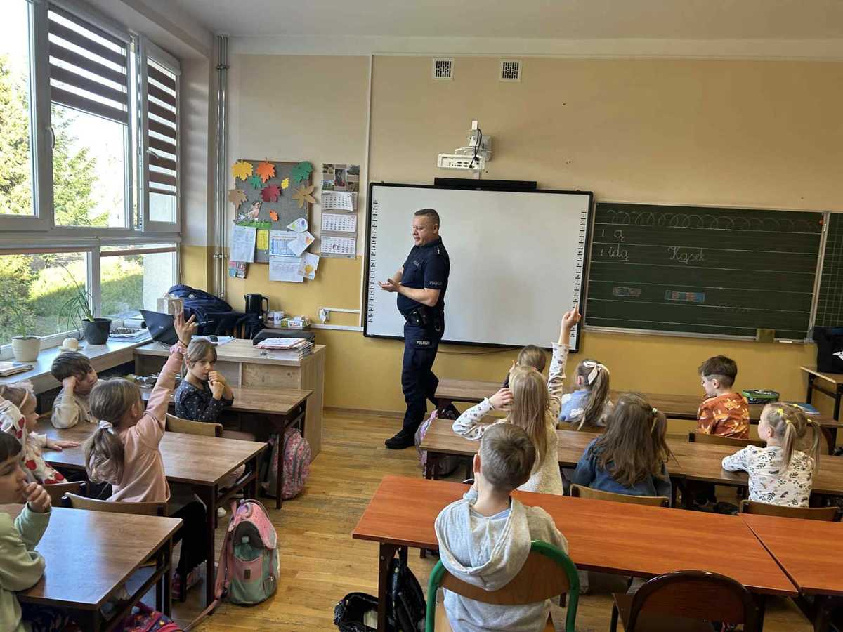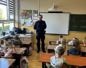 Policjanci odwiedzili Publiczną Szkołę Podstawową nr 26 im. Jacka Malczewskiego w Radomiu i spotkali się z uczniami klas pierwszych. Dzielnicowi zwracali uwagę przede wszystkim na przestrzeganie przepisów ruchu drogowego, które mają bezpośredni wpływ na bezpieczeństwo dzieci poruszających się po drogach. Przypomnieli, czego nie wolno robić na drodze, jak prawidłowo należy przechodzić przez przejście dla pieszych i którą stroną drogi iść, gdy nie ma chodnika.