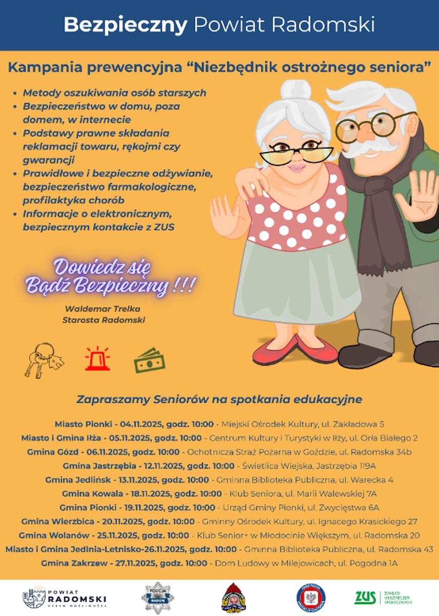 Na początku listopada rozpoczęła się kampania prewencyjna skierowana do seniorów z powiatu radomskiego pn. „Niezbędnik ostrożnego seniora”. Kampania realizowana jest przez Starostwo Powiatowe w Radomiu, a także m.in. Komendę Miejską Policji w Radomiu, Komendę Miejską Państwowej Straży Pożarnej. Wśród prelegentów jest też Powiatowy Rzecznik Konsumenta, a także przedstawiciele Zakładu Ubezpieczeń Społecznych w Radomiu i Powiatowej Stacji Sanitarno – Epidemiologicznej w Radomiu.