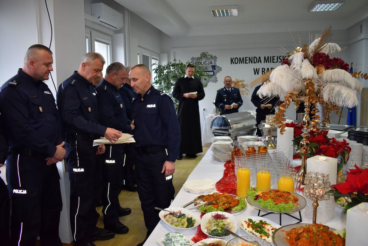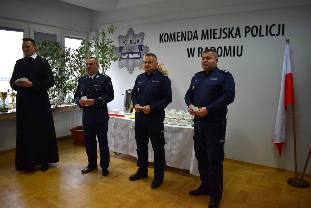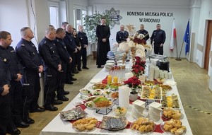 Z okazji zbliżających się Świąt Bożego Narodzenia, jak co roku policjanci podzielili się opłatkiem. Spotkanie wigilijne rozpoczęło się wystąpieniem Komendanta Miejskiego Policji w Radomiu insp. Roberta Janika, który w imieniu całego kierownictwa komendy podziękował wszystkim za całoroczny wkład w zapewnienie bezpieczeństwa mieszkańcom Radomia i powiatu radomskiego. Były także życzenia radosnych Świąt Bożego Narodzenia spędzonych w gronie najbliższych oraz aby te święta i nadchodzący Nowy 2026 Rok były spokojne i bezpieczne.