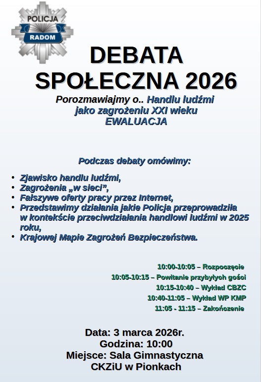 Debata społeczna o handlu ludźmi jako zagrożeniu XXI wieku odbędzie się 3 marca 2026 roku o godz. 10:00 w CKZiU w Pionkach.