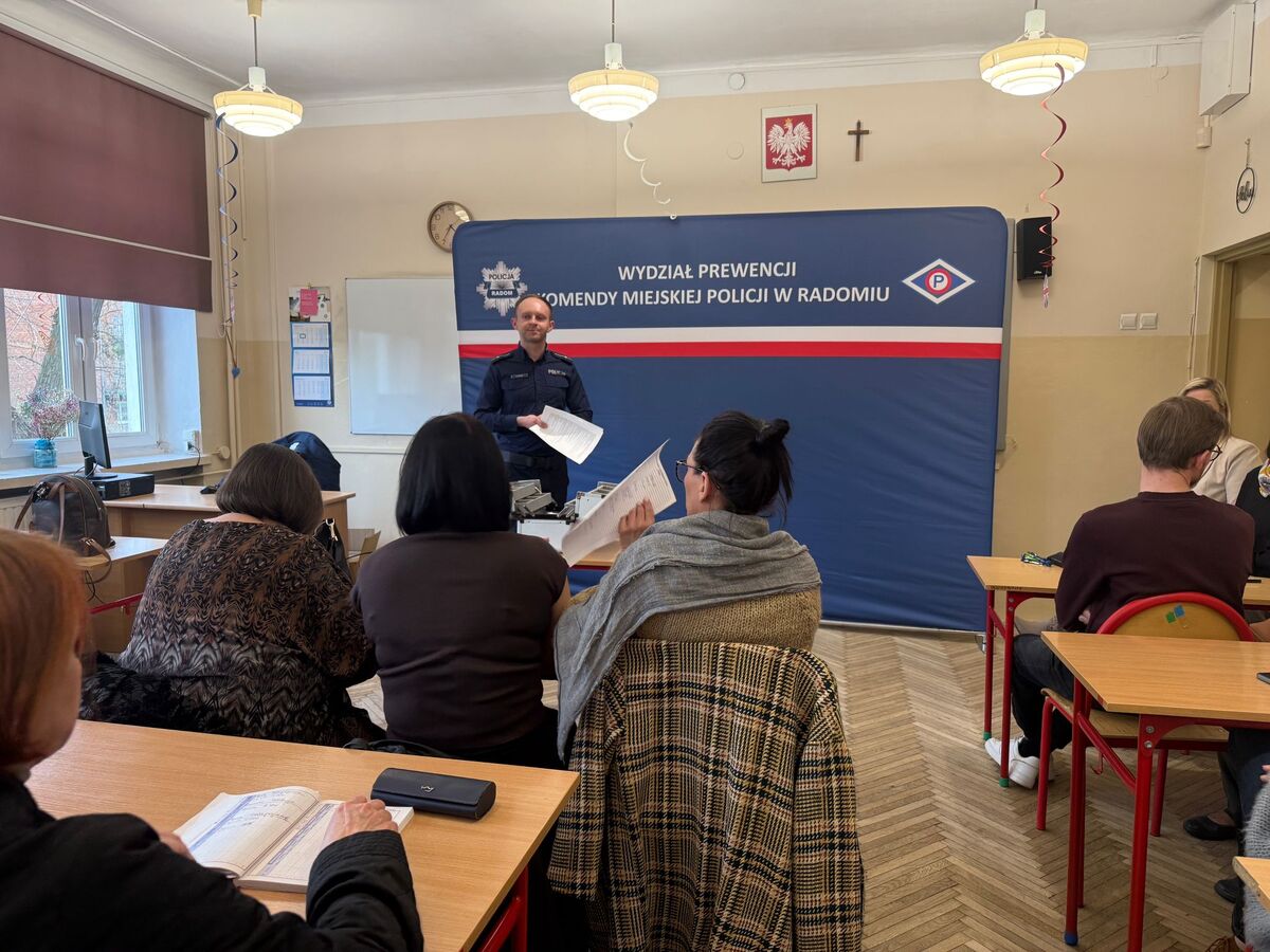 Policjanci z Wydziału Prewencji Komendy Miejskiej Policji w Radomiu spotkali się z kadrą pedagogiczną Publicznej Szkoły Podstawowej nr 7 im. Kazimierza Pułaskiego w Radomiu. Głównym tematem wizyty były zagrożenia związane z zażywaniem środków odurzających. Mundurowi zaprezentowali nauczycielom walizkę edukacyjną, która zawiera substancje przypominające narkotyki oraz przedmioty służące do ich zażywania.