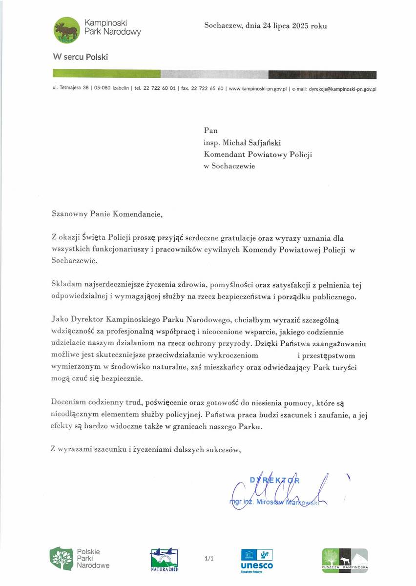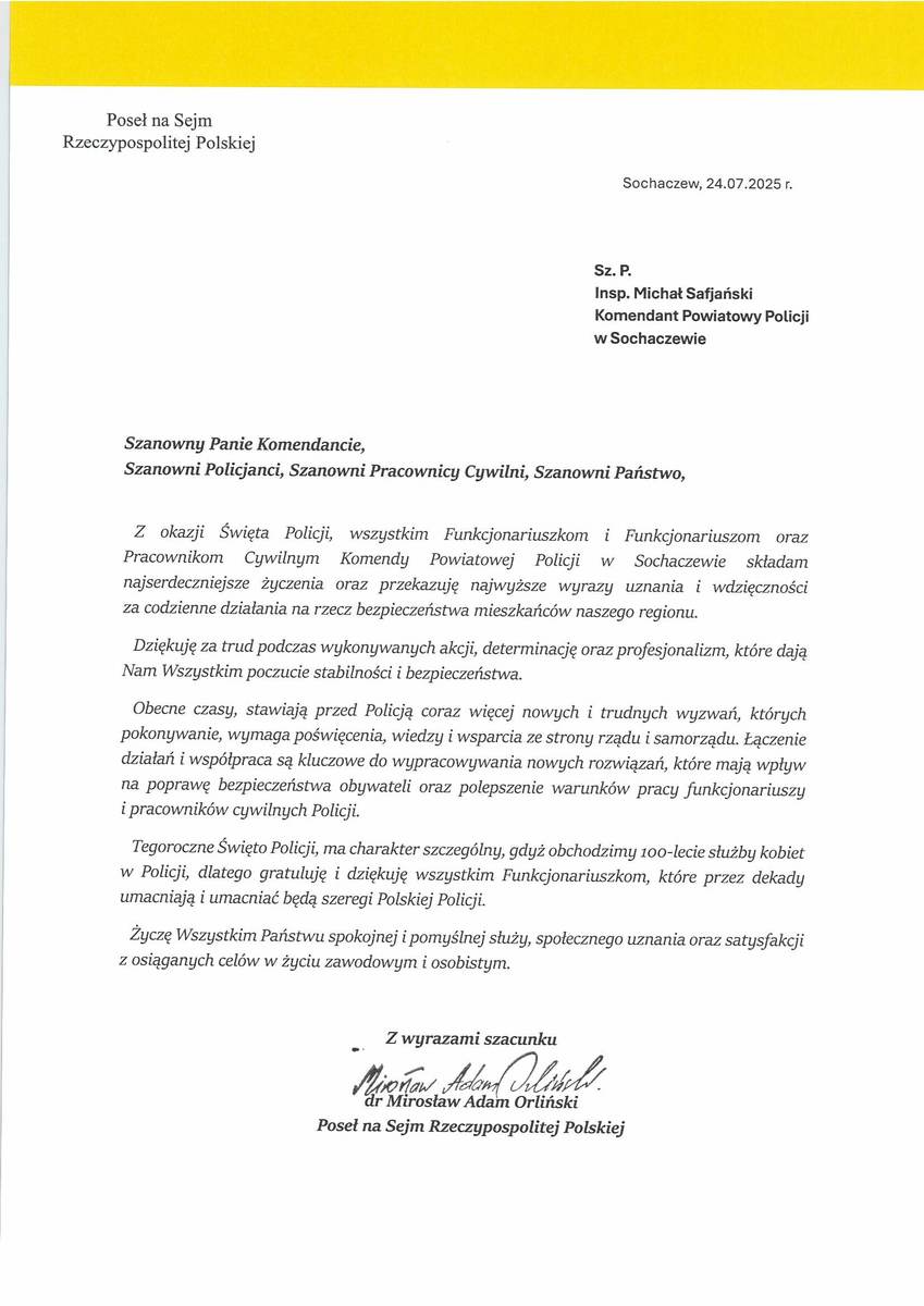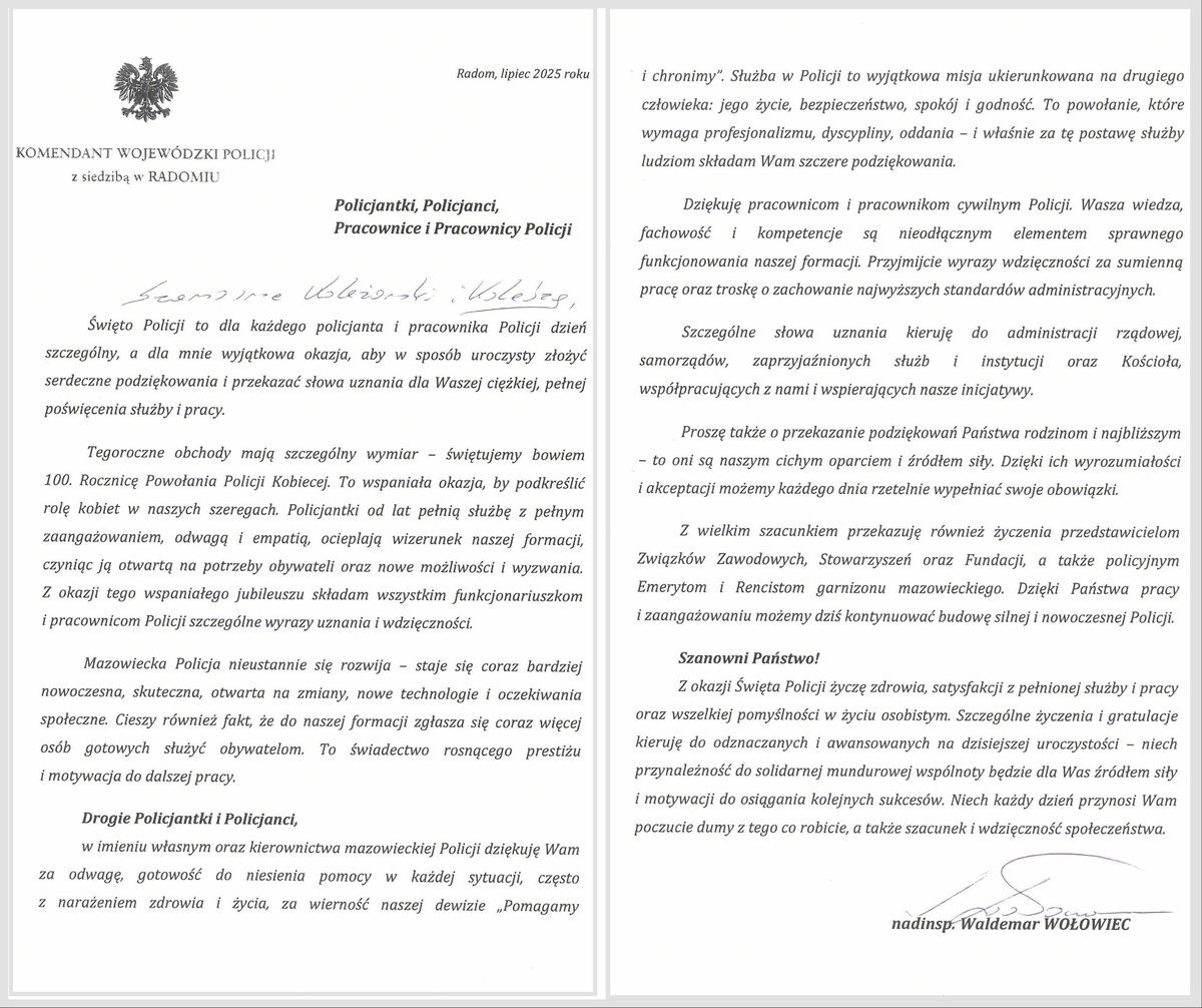 Podczas swojego przemówienia insp. Jerzy Sztuc odczytał list Komendanta Wojewódzkiego Policji zs. w Radomiu nadinsp. Waldemara Wołowca skierowany do funkcjonariuszy i pracowników Policji oraz złożył zebranym życzenia z okazji Święta Policji i podziękował za wzorową realizację obowiązków służbowych.