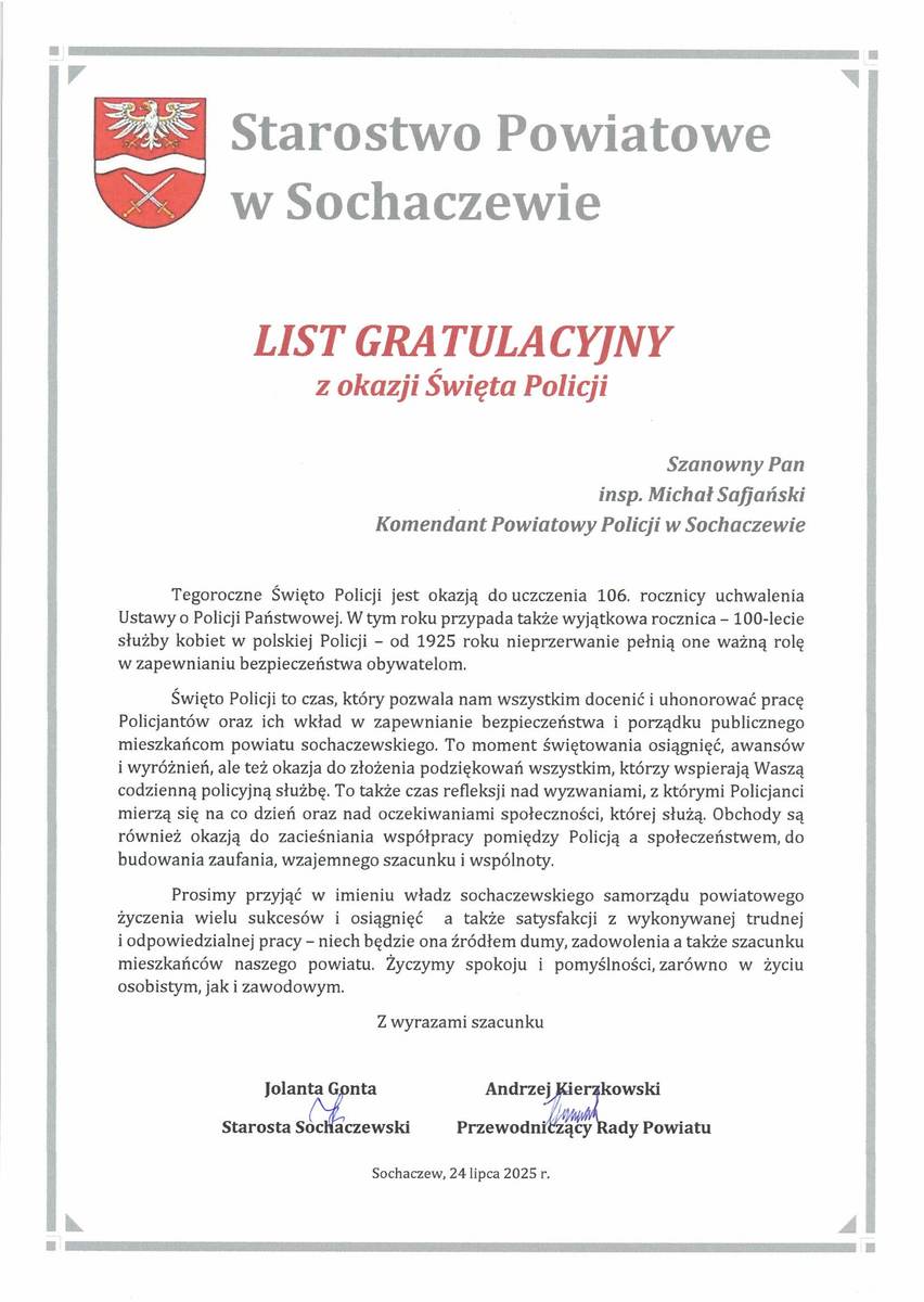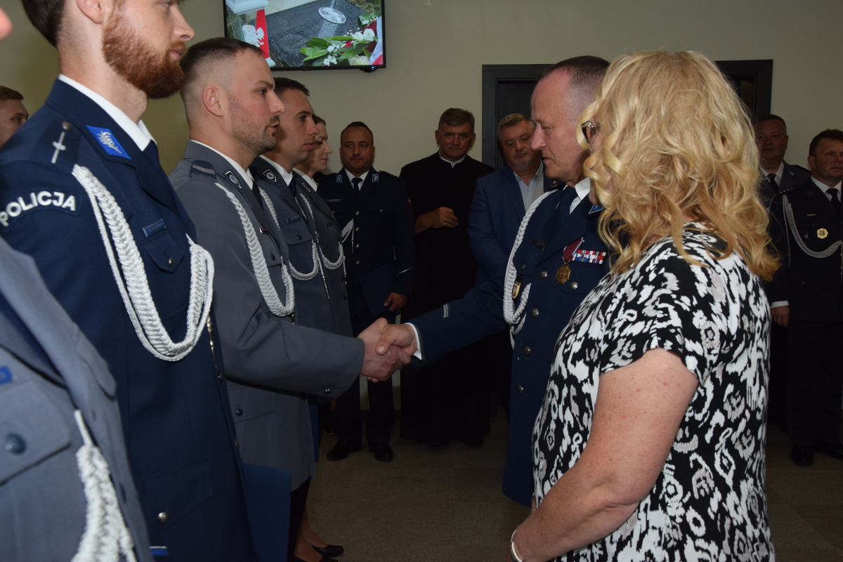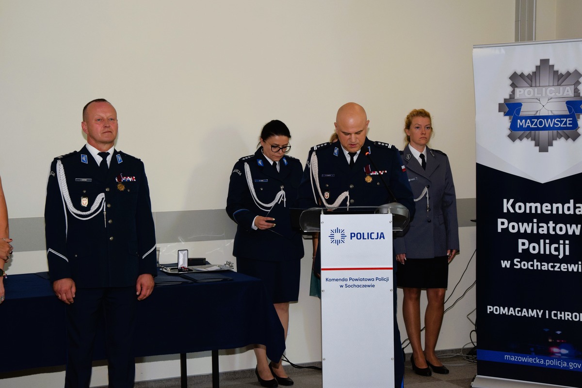 Komendant Powiatowy Policji w Sochaczewie insp. Michał Safjański powitał zaproszonych gości, a następnie w krótkim przemówieniu podziękował funkcjonariuszom za ich pracę, a przedstawicielom jednostek samorządowych i instytucjom za współpracę. Mówił również o 100. rocznicy Policji Kobiecej w Polsce i odniósł się do kandydatów do służby w Policji – prawie połowa z nich to kobiety.