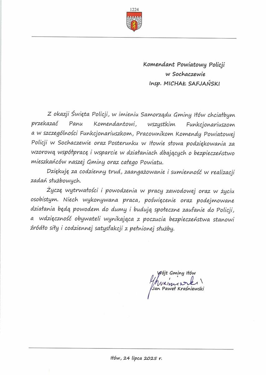 W czwartek (24.07) w sali konferencyjnej Komendy Powiatowej Policji w Sochaczewie odbyła się uroczysta zbiórka z okazji Święta Policji. Uroczystość rozpoczęła się od złożenia meldunku Zastępcy Komendanta Wojewódzkiego Policji zs. w Radomiu insp. Jerzemu Sztucowi przez asp. szt. Tomasza Kubiaka – kierownika Posterunku Policji w Iłowie. W trakcie uroczystości uczczono minutą ciszy pomordowanych i poległych na służbie funkcjonariuszy polskiej Policji, którzy rotę ślubowania wypełnili do końca.