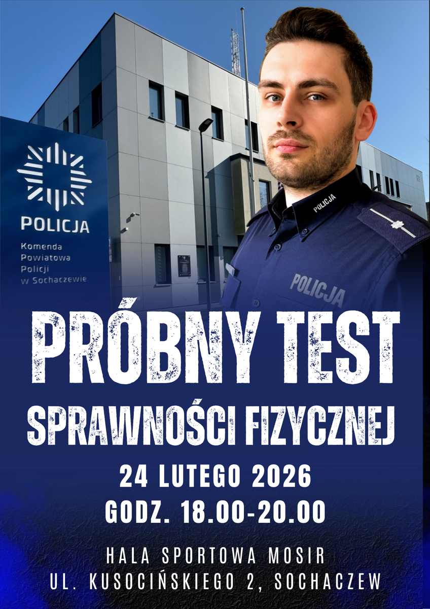 Komenda Powiatowa Policji w Sochaczewie organizuje próbny test sprawności dla kandydatów do służby w Policji. Zapraszamy 24 lutego 2026 roku w godz. 18:00-20:00 do hali sportowej Miejskiego Ośrodka Sportu i Rekreacji przy ul. Kusocińskiego 2 w Sochaczewie. To szansa na sprawdzenie swoich możliwości w warunkach zbliżonych do oficjalnego etapu rekrutacji. Poznacie wymagania fizyczne oraz będziecie mieli okazję porozmawiać z policjantami, którzy odpowiedzą na wszystkie pytania dotyczące służby i naboru.