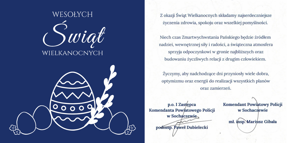 Życzenia świąteczne Data publikacji 02.04.2026 Powrót Drukuj Życzenia kierownictwa Komendy Powiatowej Policji w Sochaczewie z okazji Wielkanocy.
