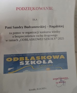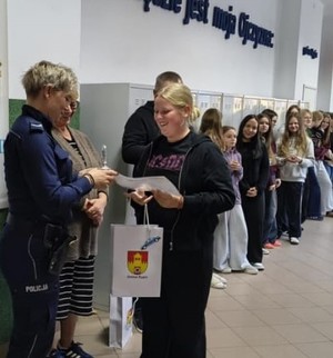 W poniedziałek, 20 października, w ramach współpracy z nauczycielami i uczniami Szkoły Podstawowej w Kowalkach, funkcjonariuszka wsparła szkolny konkurs wiedzy o bezpieczeństwie w ruchu drogowym. Podczas tego wydarzenia przekazała dzieciom odblaski, gadżety i drobne upominki, zachęcając je do codziennego noszenia elementów odblaskowych.