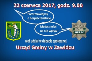 Samorząd Gminy Zawidz oraz Komendant Powiatowy Policji w Sierpcu serdecznie zapraszają wszystkich mieszkańców Gminy Zawidz na debatę o bezpieczeństwie, która odbędzie się w czwartek 22 czerwca 2017 roku o godzinie 9.00 w Sali Konferencyjnej Urzędu Gminy w Zawidzu.
