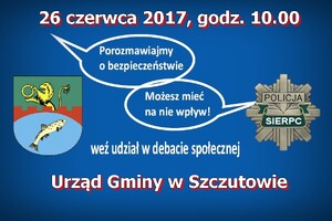 - Porozmawiajmy o bezpieczeństwie Gminy Szczutowo - zaproszenie na debatę Samorząd Gminy Szczutowo oraz Komendant Powiatowy Policji w Sierpcu serdecznie zapraszają wszystkich mieszkańców Gminy Szczutowo na debatę o bezpieczeństwie, która odbędzie się w poniedziałek 26 czerwca 2017 roku o godzinie 10.00 w Sali Konferencyjnej Urzędu Gminy w Szczutowie.