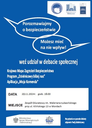 Komenda Miejska Policji w Siedlcach zaprasza mieszkańców gminy Mordy na ewaluacyjną debatę społeczną „Porozmawiajmy o bezpieczeństwie - możesz mieć na nie wpływ”, która odbędzie się 20 listopada (br.) o godz. 16.00 w Zespole Oświatowym im. Waleriana Łukasińskiego przy ul. Kilińskiego 13 w Mordach.