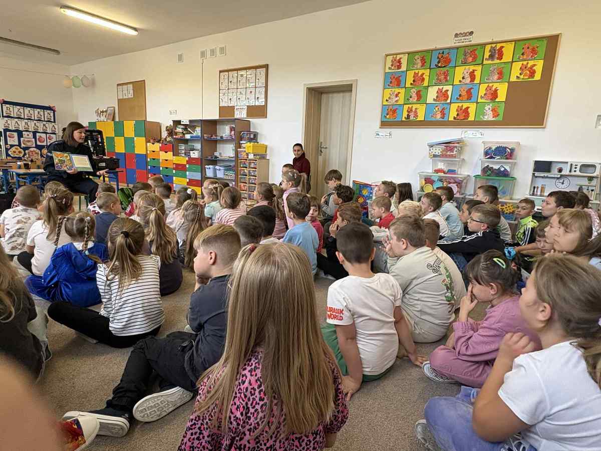 Dzieci z dużym zainteresowaniem wysłuchały bajki, a następnie aktywnie uczestniczyły w rozmowie o tym, dlaczego warto nosić elementy odblaskowe, jak bezpiecznie poruszać się po drogach, oraz kiedy i do kogo zwrócić się o pomoc w trudnych sytuacjach.