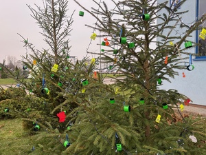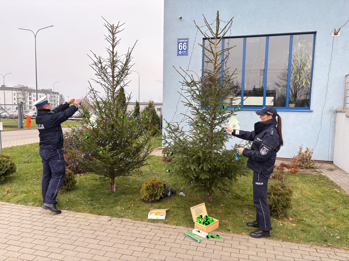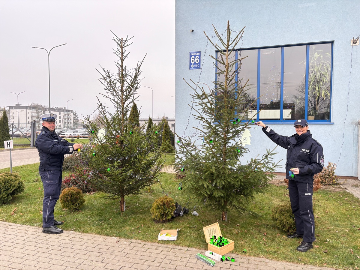 Przed siedzibą Komendy przy ul. Starowiejskiej 66 stanęły świąteczne choinki, ozdobione nie tylko lampkami, ale także elementami odblaskowymi. Każdy mieszkaniec, który przyniesie bombkę - własnoręcznie wykonaną lub gotową, może zawiesić ją na policyjnej choince i w zamian zabrać ze sobą odblask.