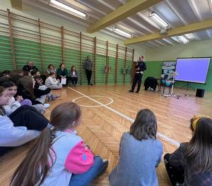 Spotkanie przebiegało w miłej i otwartej atmosferze. Uczniowie chętnie zadawali pytania, dzielili się swoimi doświadczeniami oraz aktywnie uczestniczyli w rozmowie, co świadczy o dużym zainteresowaniu tematyką bezpieczeństwa.