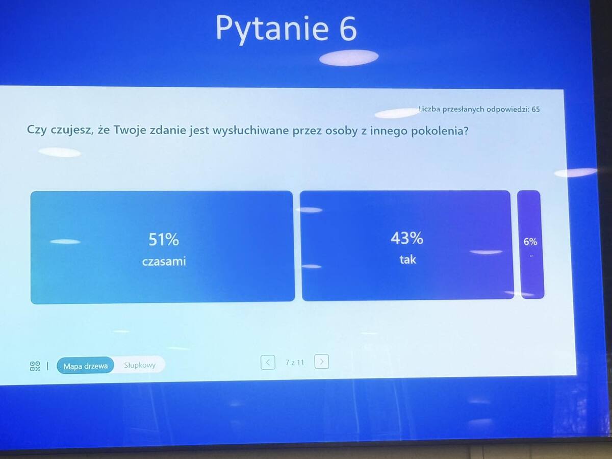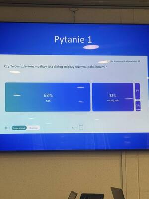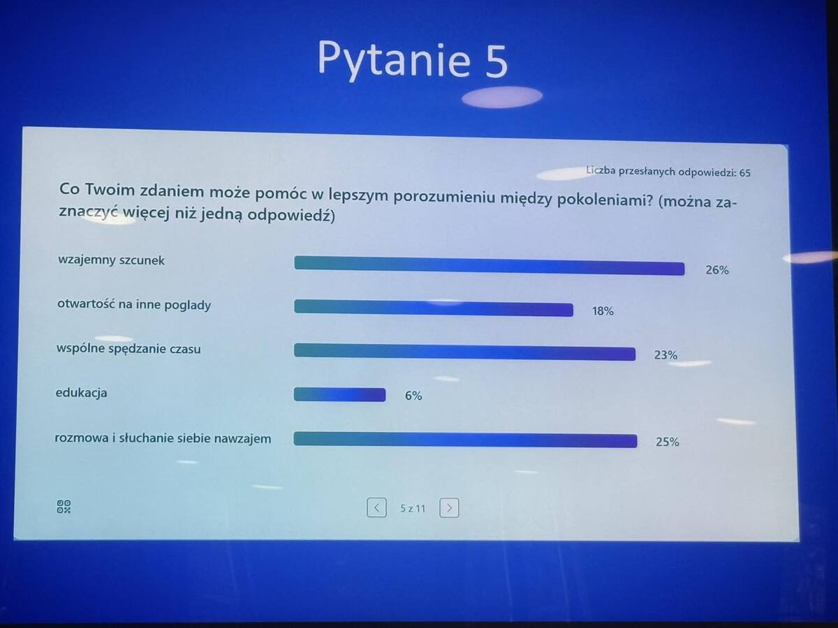 Podczas debaty uczniowie aktywnie włączali się w dyskusję, odpowiadając na pytania dotyczące możliwości prowadzenia dialogu międzypokoleniowego oraz czynników, które mogą utrudniać wzajemne porozumienie. Z przeprowadzonej wśród uczestników ankiety wynika, że 63% respondentów uważa, iż dialog pomiędzy pokoleniami jest możliwy, natomiast 55% wskazało, że bardzo często rozmawia z osobami z innych pokoleń. Jednocześnie jako główne bariery w komunikacji wskazano rozwój technologii, różnice w wartościach oraz brak czasu. Uczestnicy debaty zwracali uwagę, że kluczową rolę w budowaniu wzajemnego zrozumienia odgrywają: wzajemny szacunek, otwarta rozmowa, umiejętność słuchania drugiej osoby oraz wspólne spędzanie czasu.