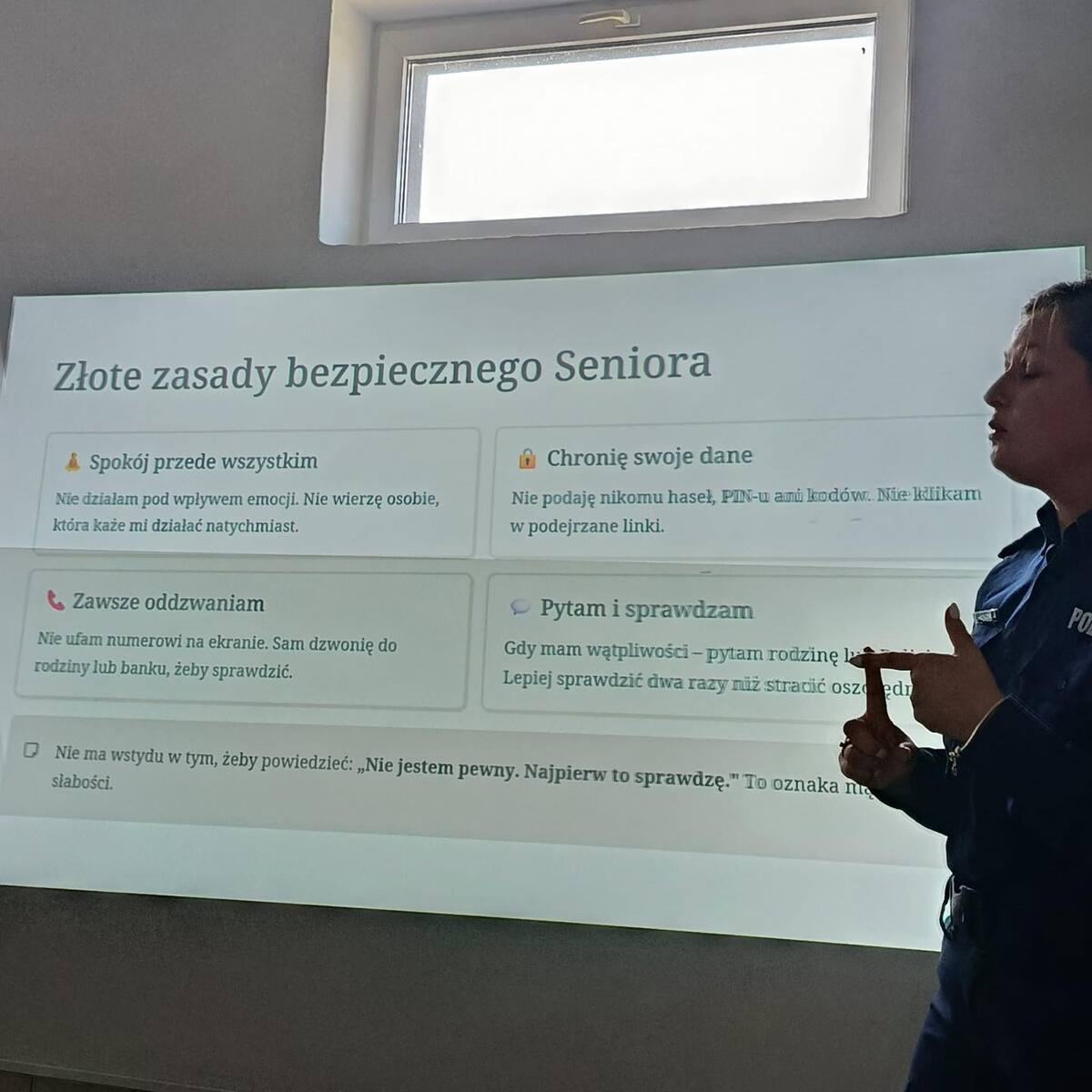 Funkcjonariuszka z Komendy Miejskiej Policji w Siedlcach omówiła najczęściej stosowane metody działania przestępców. Seniorzy poznali schematy oszustw „na wnuczka” oraz „na policjanta”, a także dowiedzieli się, jak rozpoznać fałszywe wiadomości SMS, e-maile czy próby wyłudzenia kodu BLIK.