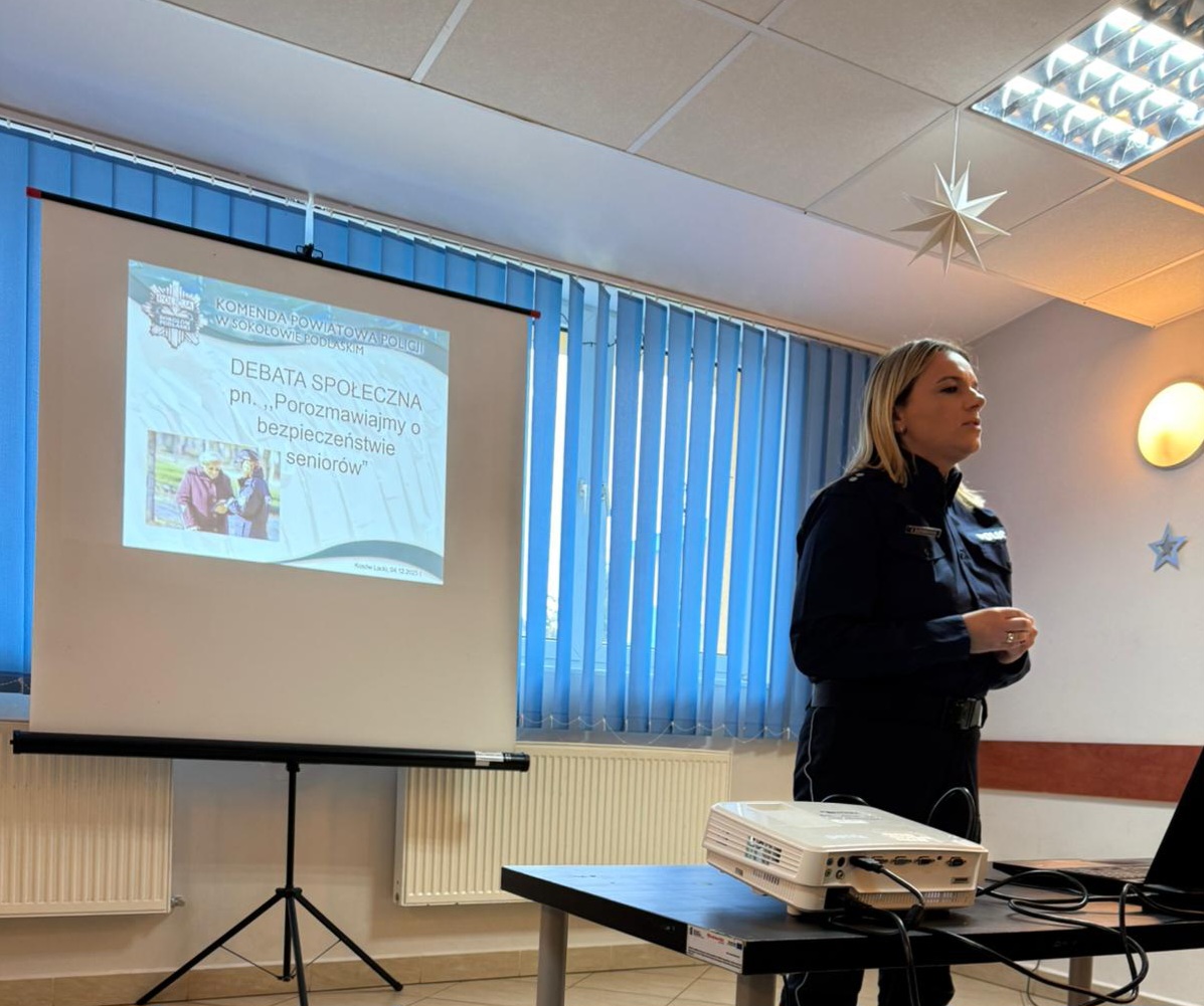 Podczas debaty przedstawiono najpoważniejsze zagrożenia, na jakie narażeni są seniorzy. Szczegółowo omówiono mechanizmy działania sprawców oszustw metodą „na wnuczka” oraz „na policjanta”. Zaprezentowano także obszary ruchu drogowego, w których osoby starsze są szczególnie zagrożone, wraz z danymi dotyczącymi zdarzeń z udziałem pieszych i rowerzystów na terenie powiatu sokołowskiego. Seniorom przedstawiono również wirtualne narzędzia służące do kontaktu z Policją, takie jak Krajowa Mapa Zagrożeń Bezpieczeństwa oraz aplikacja Moja Komenda.
