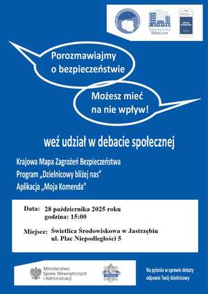 Komendant Powiatowy Policji w Szydłowcu insp. Jacek Hebda serdecznie zaprasza na debatę społeczną pn. "Bezpieczeństwo Seniorów to nasza wspólna sprawa". Debata odbędzie się 28 października 2025 roku, o godzinie 15:00 w Świetlicy Środowiskowej w Jastrzębiu.