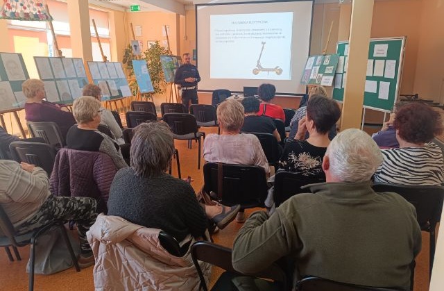 Głównym punktem spotkania było wystąpienie funkcjonariusza z Wydziału Ruchu Drogowego Komendy Powiatowej Policji w Węgrowie, który omówił szczegółowo zagrożenia, z jakimi seniorzy mogą spotkać się na drodze- zarówno piesi, rowerzyści, jak i kierowcy.