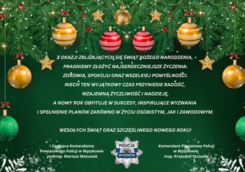 Przed nami Święta Bożego Narodzenia, to bez wątpienia czas miłości i przebaczania, ale także czas wypełniony tradycją i rodzinnym ciepłem. Na te wyjątkowe chwile Komendant Powiatowy Policji w Wyszkowie insp. Krzysztof Szczudło, w imieniu kierownictwa oraz własnym, pragnie złożyć Państwu najserdeczniejsze życzenia.