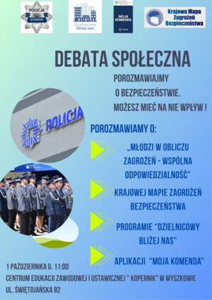 Komendant Powiatowy Policji w Wyszkowie zaprasza wszystkich zainteresowanych mieszkańców z powiatu wyszkowskiego na debatę społeczną poświęconą bezpieczeństwu dzieci i młodzieży pn. „Młodzi w obliczu zagrożeń - wspólna odpowiedzialność”, która odbędzie się 1 października 2025 roku o godzinie 11.00 w Centrum Edukacji Zawodowej i Ustawicznej " Kopernik" w Wyszkowie ul. Świętojańska 82. Serdecznie zapraszamy do udziału w debacie.