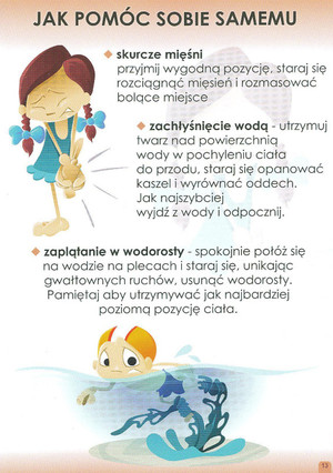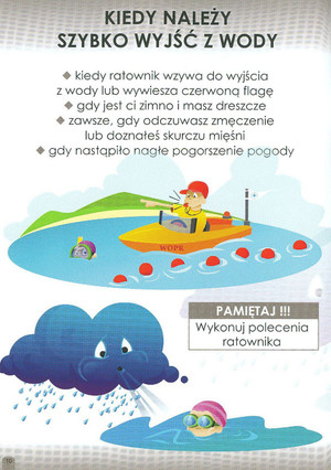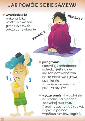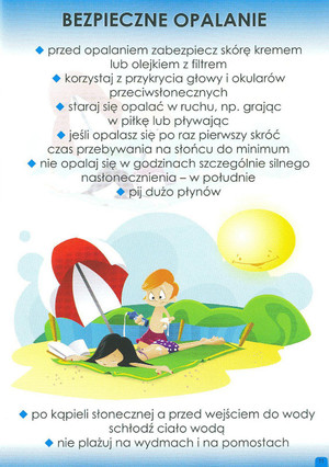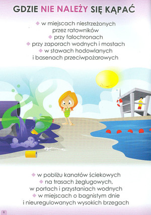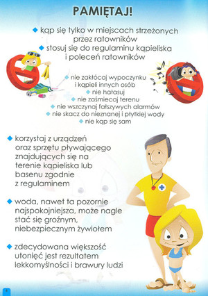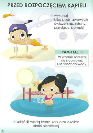 - Zadbajmy także o bezpieczeństwo „zdrowotne" - aby uniknąć tzw. wstrząsu termicznego w wodzie, zanurzamy się stopniowo oraz nie kąpiemy się bezpośrednio po dłuższym opalaniu.