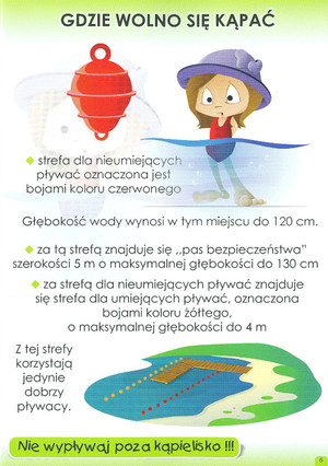 - Przed kąpielą zapoznajmy się ze wszystkim znakami i instrukcjami oraz zorientujemy się, gdzie znajduje się stanowisko ratownika oraz punkt pierwszej pomocy.